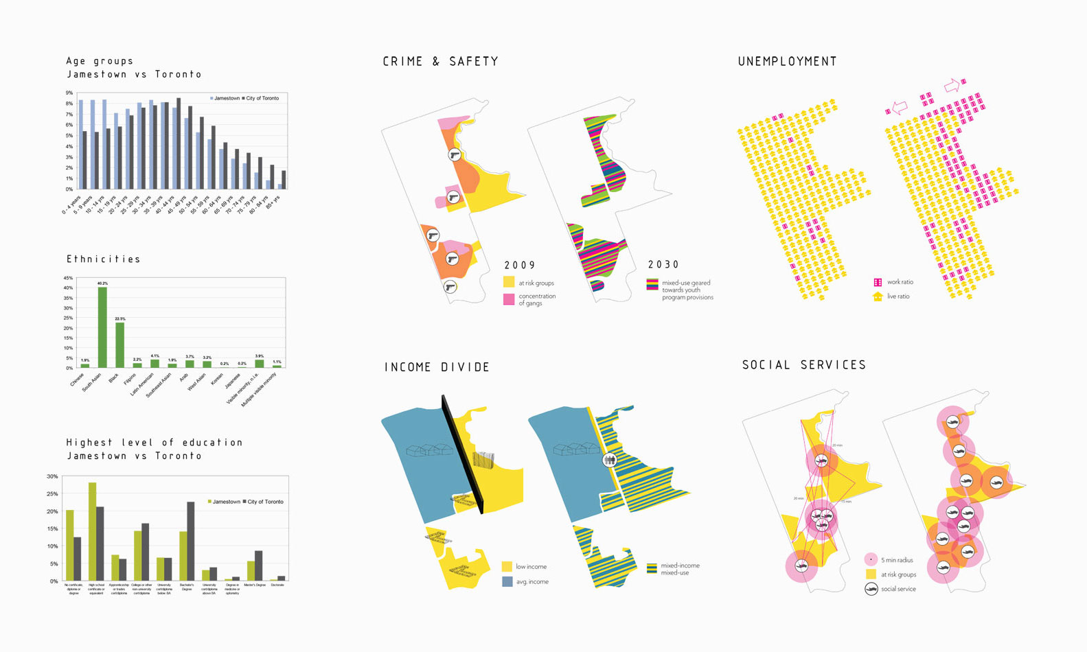 What — A study into Toronto's Jamestown Neighbourhood, a neighbourhood confronting issues of gang violence and poverty, and a multi-scalar response involving a restructure in governance, youth initiatives, housing, the Humber River, public space and making connections.